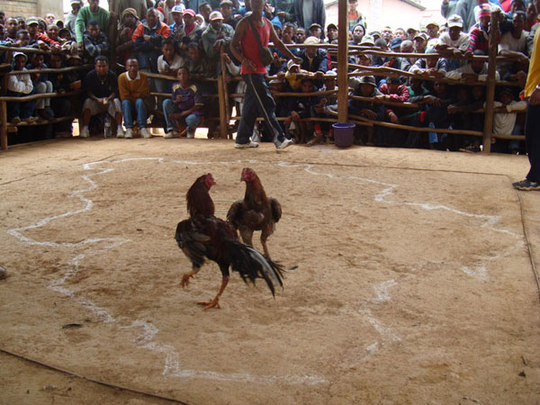 Samantala, pinagsalpuk na ang dalawang manok, na ilang sandali lang ay kapwa sugatan. Pero matindi ang sa puti. May tarak ito sa dibdib samantalang ang sa pula naman ay sa pakpak lamang. Gayunman, unang bumulagta ang puit na nagkikisay at sumunod naman ang pula na ipinipikit ang mga mata. Ang nanalo sa labanan ay ang pula. Hiyawang umaatikabo ang sumunod.